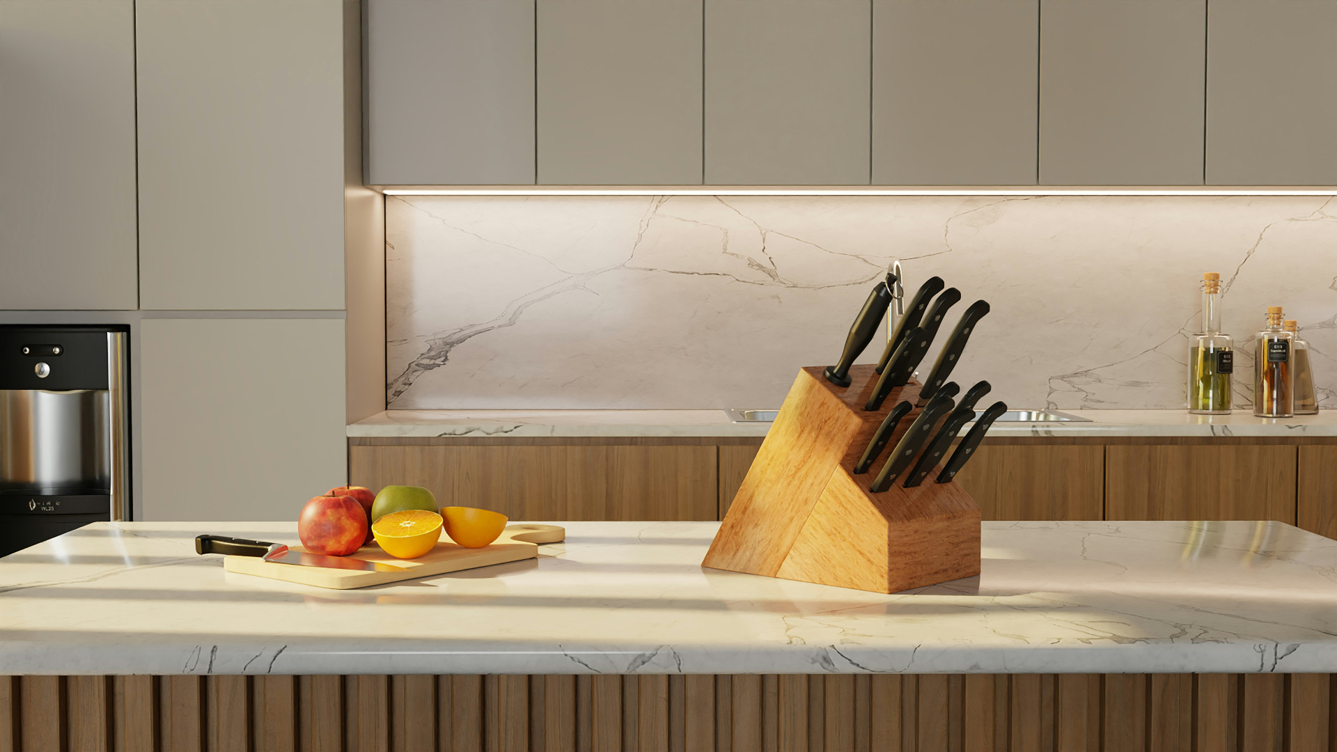 - Hav knive, skærebrætter og krydderier nær forberedelsesområdet.